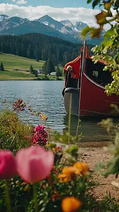 This picture is like a postcard from a dream vacation! Imagine waking up to those majestic mountains reflected in the crystal-clear lake. You could spend your days lazily floating in a boat, maybe even reading a good book or taking a nap (without getting sunburnt, of course!). But don’t get too comfy, because the vibrant flowers around you are calling out for a fun afternoon of exploring and smelling the fresh air!