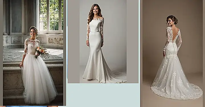 Talk about a dress that makes you want to spin around and maybe even break into a happy little dance! This stunning gown, with its elegant off-the-shoulder neckline and those absolutely dreamy lace sleeves, makes anyone look like they just stepped out of a fairytale. It’s the kind of dress where you glide, you sparkle, and you probably won’t even notice if you accidentally step on a few toes while showing off that beautiful train. And if it were crafted from sustainable organic cotton, you wouldn’t just be a vision, you’d be a planet-saving fashion icon!