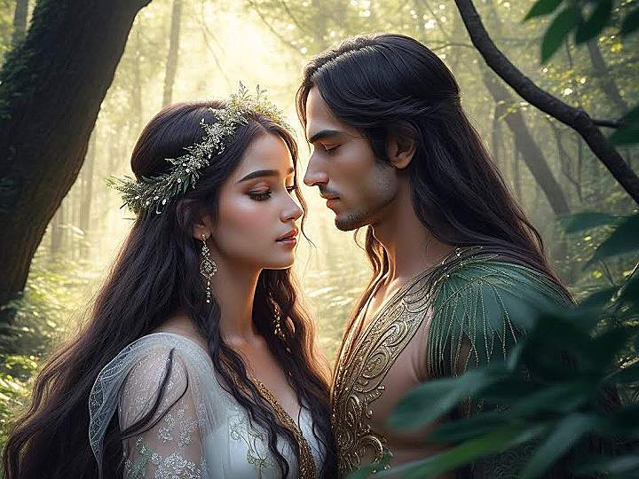 In a land where time stood still, Lada, the goddess of love and fertility, wandered through a garden, basking in the rebirth of nature. Unbeknownst to her, Lado, the god of harmony and joy, was drawn to the same garden. As their eyes met, a spark ignited, and the world around them seemed to sing a sweet melody.