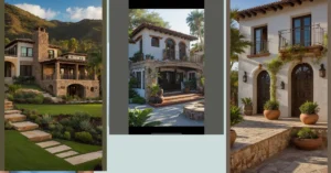 Take a peek at those killer details: the shiny glass railings that make the balcony feel like a VIP lounge, and that huge wooden front door practically begging for a grand entrance. Even the outdoor lights are perfectly placed, making everything glow like it’s ready for a fancy party every night. This isn’t just a house; it’s practically a secret superhero HQ, ready for all your epic plans. With its mix of cool stone, sleek glass, and warm wood, this modern pad has all the perks you’d want in a dream house, without any of the old-school vibes.