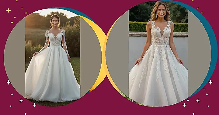 Planning a wedding? Picking a dress is like choosing your spirit animal, but way fancier! Check out this dreamy long dress. It’s got sleeves with lace that look like they were drawn by fairies, and the skirt? Total princess vibes. Just imagine twirling around in that thing during your first dance – you’ll be the star of your own rom-com!