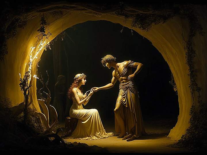 Orpheus used his divine music to charm the creatures of the Underworld and even soften the hearts of Hades and Persephone, who allowed him to bring Eurydice back to the world of the living. But there was a condition: he should not look back at her until they had left the Underworld.