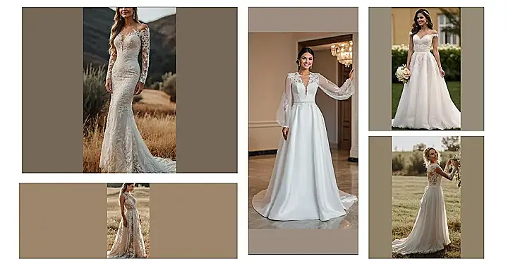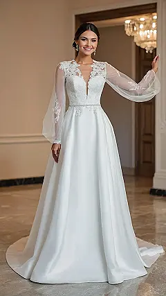 Seriously, look at all that lace! It’s like a delicate, beautiful spiderweb, but instead of catching bugs, it’s catching hearts. And the long sleeves? Perfect for those breezy outdoor weddings where you wanna look amazing but also, you know, stay warm. Forget about being a princess; with this dress, you’re a bohemian queen, ready to rule your own happy ever after. Just try not to trip over the train when you’re doing the electric slide!