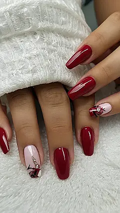 Okay, so Valentine’s Day is coming, and you need nails that scream, “I’m fabulous and ready for romance (or pizza and a rom-com, whatever)!” These red nails are like the perfect little black dress of the nail world – classic, but still makes a statement. Plus, the gold accents and bling? It’s like saying, “I’m not trying too hard, but I definitely put some effort into this.” You could even add a tiny heart or two if you’re feeling extra!