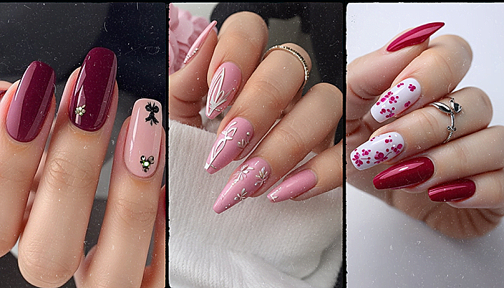 The contrast between the deep mauve and the soft pink, punctuated with the dainty designs, paints a picture of a love that’s both intense and tender. The perfect blend of bold and gentle, these nails are a testament to love’s myriad expressions. Adorning your fingertips with this design is like carrying with you a tale of love that’s both passionate and poetic, waiting to be told and retold.