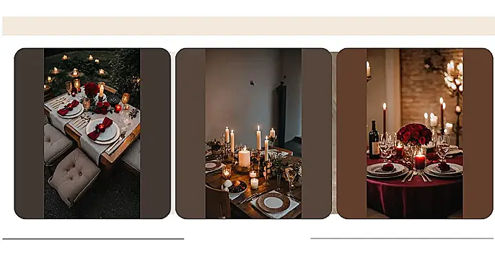 Talk about turning up the heat! This dinner table is practically a masterclass in ‘romantic vibes only,’ complete with a sea of deep red and enough candles to light up a small castle. You’ve got to wonder if the person setting this up had a fire safety plan, because those flickering flames are everywhere, making everything glow. It’s definitely a look that says, “Tonight, we’re not just eating; we’re experiencing peak fancy-pants dining, possibly with a side of awkward compliments.”
