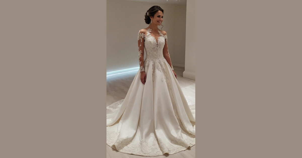 Planning a wedding? Picking a dress is like choosing your spirit animal, but way fancier! Check out this dreamy long dress. It’s got sleeves with lace that look like they were drawn by fairies, and the skirt? Total princess vibes. Just imagine twirling around in that thing during your first dance – you’ll be the star of your own rom-com!