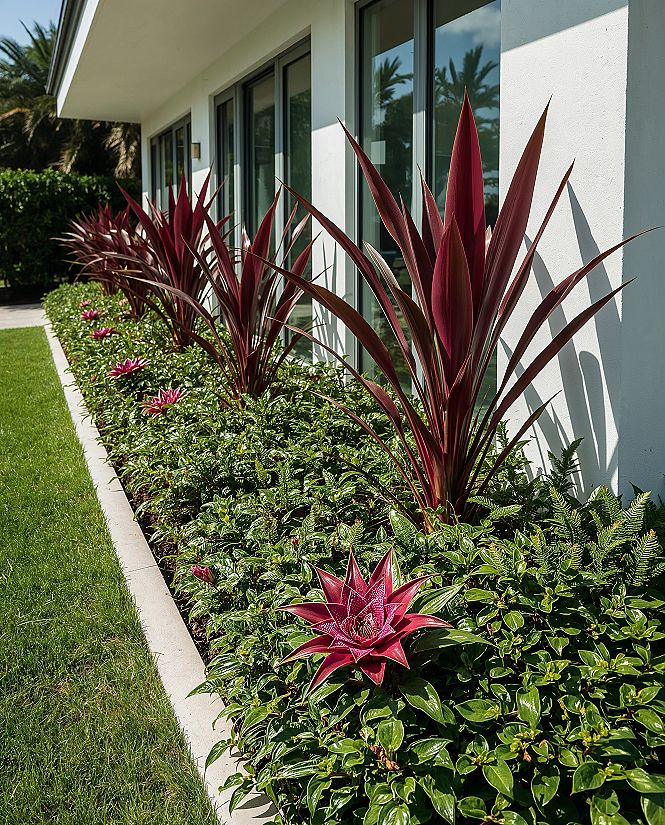 Boost your home’s charm with these breathtaking tropical flower beds for front yards, featuring striking Hawaiian Ti Plant landscapes and vibrant foliage. These designs promise incredible landscaping for curb appeal, making a bold statement.