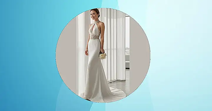 The sleek, modern silhouette is totally flattering, and the way the fabric flows is just dreamy. Imagine walking down the aisle looking like a total princess…but a princess who also rocks a high-neck halter neckline! This dress is proof that you can be sophisticated and fun, all while still saying “I do” in style. It’s the perfect blend of classic elegance and a little bit of unexpected fun – just like the best wedding ever!