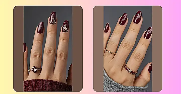 Now, let’s talk about that ring finger! It’s rocking a golden, sparkly design that practically screams ‘I woke up like this, but also I’m a secret fairy queen.’ Paired with those awesome gold rings, this whole look is just the right amount of extra, showing everyone you’re here to slay. So, if you’re hunting for maroon nails inspo that makes a statement without you even having to say a word, grab your nail polish because this is your sign to level up!