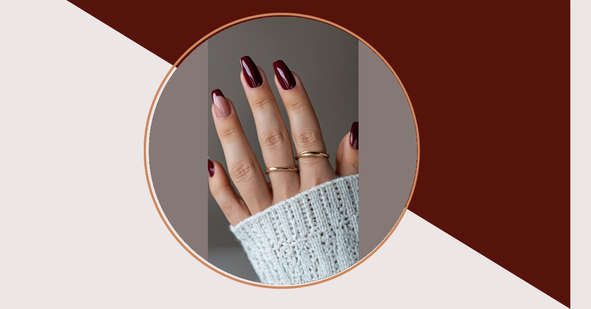 Notice that one nail playing peek-a-boo with a nude base and a sassy maroon tip? That’s how you mix things up! It adds a playful twist to the classic deep red, proving you can be both bold and subtle at the same time. Plus, those two wavy gold rings are giving off major cool-girl vibes, perfectly matching the warm tones, and that snuggly white sweater just screams “fashionably cozy.” This whole combo shows how your maroon nails can totally level up any outfit, from chill study sessions to weekend adventures.