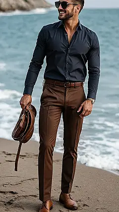 Check out this guy, ready to hit the beach… or maybe a super fancy beach party? He’s rocking a crisp, dark blue button-up shirt that looks like it just came from the dry cleaners, paired with some seriously sharp brown trousers. And get this – he’s got shiny brown dress shoes on the sand! You might think he’s about to give a presentation to a school of fish, but he pulls off this ‘boardroom meets boardwalk’ look with absolute swagger, holding a cool brown hat. He’s basically saying, “Yeah, I look this good even when I’m just chilling by the waves.”