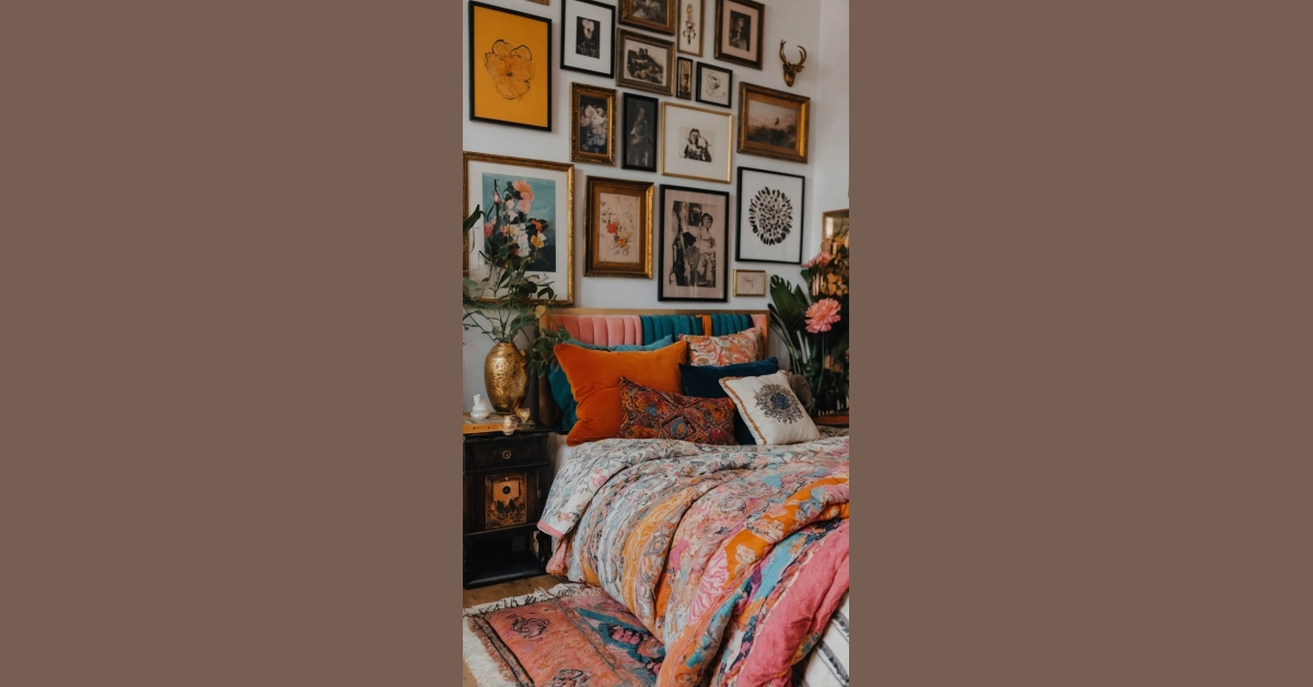 Step into this bedroom, and you might think a rainbow exploded, then an art gallery decided to crash the party, and honestly, we’re here for it! This isn’t just a room; it’s a full-blown visual feast where ‘less is more’ clearly got lost on the way. Check out that epic gallery wall, packed with so many framed treasures it’s practically a museum exhibit dedicated to coolness. Every single picture tells a story, and together they create a vibe that screams ‘I’m fabulous, and I know it’ – which is totally the energy we all need for our morning routine!