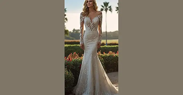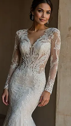 Forget clunky princess dresses! This mermaid style is all about graceful movement. The flowing train trails behind you like a shimmering ocean wave, making it perfect for creating stunning photos. And those long sleeves? They’re not just pretty – they’ll keep you feeling warm and comfy, even if you have your ceremony outdoors. It’s the perfect blend of classy and comfy. Now, all you need is a prince (or a really nice person!) and a fantastic wedding party!