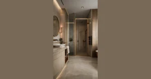 This room is like a zen garden for your eyes! It’s so simple and clean, it’s almost like it’s saying, “Hey, relax, take a deep breath, and enjoy the peace.” There’s just a hint of gold with that cool little vase, and those wooden shapes just blend right in with the walls. It’s so minimalist, even the shadows look stylish!