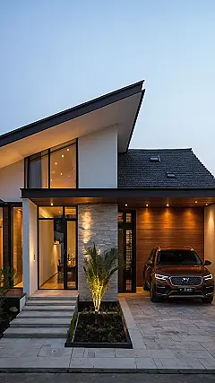 Check out this place! It’s like someone said, “Let’s build a house that looks super grown-up and fancy, but also totally chill for a Netflix marathon.” You’ve got this cool mix of classic stone on one side, which probably makes you think of old castles or maybe your grandma’s really solid fireplace. Then BAM! It’s paired with sleek, dark modern panels and huge windows that practically beg for you to throw open the curtains and let the sunshine in (or show off your epic gaming setup). It’s like the house decided it couldn’t pick just one style, so it went with ‘all of the above’ and somehow made it work perfectly, proving that different vibes can totally get along.
