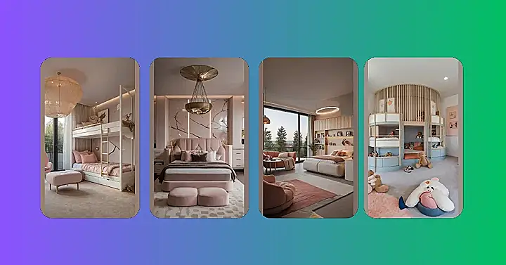 Whoa, check out this bedroom! It looks less like a place to just sleep and more like an exclusive club for awesome kids who get their own personal tent-beds. Forget boring bunks, these beds are basically indoor luxury campsites where you can hide from your problems (like homework!) and have the fanciest sleepover ever. With all those fluffy pillows and cozy vibes, you’d probably never want to leave. It’s like sleeping on a marshmallow cloud designed by a millionaire unicorn.
