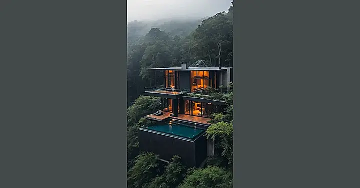 This isn’t just any house; it’s a full-blown forest mansion that looks like it was designed by a squirrel architect who got really good at geometry. Perched right among those towering trees, with enough stone and wood to make a lumberjack blush, it’s basically the ultimate fancy treehouse for grown-ups. You could probably wave to the squirrels from your balcony without even trying too hard. Living here would make you the coolest kid on the (forest) block, probably with a permanent tan from all the natural light streaming in through those massive windows.
