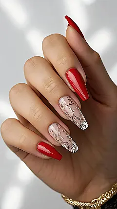 Who knew fall could look this glam on your fingertips? We’ve got two nails rocking a seriously vibrant, glossy red that practically dares autumn leaves to try and outshine them. Then, the other two are rocking a subtle nude base with these incredible golden vine-like patterns, almost like tiny, fancy grapevines or abstract autumn leaves decided to get all dressed up for a fancy party. These aren’t just nails; they’re tiny works of art that probably require a personal assistant just to avoid poking yourself when reaching for your phone!