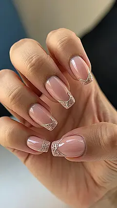Check out those amazing silver tips! They aren’t just a splash of color; they’ve got cool patterns and shine that totally steal the show. Instead of just a painted line, these tips are like mini works of art sitting right there at the end of your nail. It makes the pretty pink part pop even more and guarantees that nobody will call these nails basic ever again. Get ready for some serious compliments!