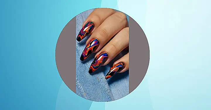 These nails are totally rocking the November vibe! With their funky blue and orange swirls, they’re like a mini-explosion of fall colors on your fingertips. It’s like the leaves are changing, but instead of trees, it’s happening on your nails! Imagine all the compliments you’ll get when you show off these awesome nails.
