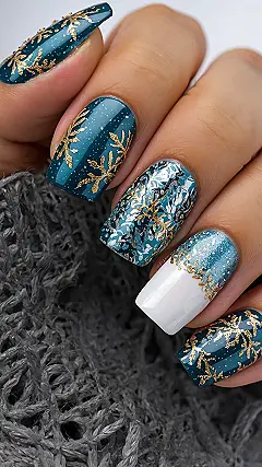 These aren’t just nails; they’re miniature masterpieces! One finger is rocking a full-on winter wonderland party with all that intricate foil and sparkle, while another boasts a chic white tip with a gradient that looks like fresh snow kissed by a teal sunset. You could totally use these to distract from any awkward family photos or to effortlessly point to the last slice of Christmas pie. They’re so eye-catching, you might even get away with wearing sweatpants to your next holiday gathering – because with nails this epic, who’s looking at your joggers?