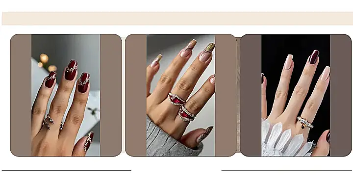 These nails are like a fancy French manicure that went to a fancy fall party! The deep red color is like the leaves changing, and the sparkly gold details are like the first frost on a crisp autumn morning. They’re so elegant, they practically scream “I’m ready for pumpkin spice lattes and cozy sweaters!”