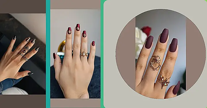 Those nails are rocking a seriously chic burgundy shade, perfect for the autumn vibes! It’s like the color of a cozy sweater and pumpkin spice latte all rolled into one. And that ring? It’s like the cherry on top of your fall-tastic look! It’s giving off some serious “I’m ready for sweater weather and pumpkin carving” vibes.