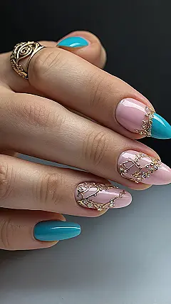 Check out that fancy gold stuff and those tiny sparkles! It looks like little magical vines grew right on your nails, dripping with dewdrops or maybe tiny fairy diamonds. They take the pink and blue fun up a notch, making your hands look like they just walked out of a secret enchanted garden party. Plus, imagine catching the sunlight on that bling while you’re scrolling through TikTok or grabbing snacks. Instant mood booster! These nails are basically accessories all on their own, perfect for showing off your awesome summer style.