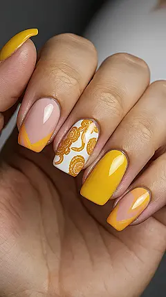 Forget boring beige, this mani is all about making a statement without even trying! That accent nail is like a secret garden of sunny swirls, totally unique and ready for all your Insta selfies. And those geometric Vs and wavy lines? They’re giving off major ‘cool kid’ energy, perfect for high-fiving your friends at the fair or grabbing that last slice of pizza. These nails are so much fun, they might just convince the ice cream truck to come to *your* street first. So go ahead, embrace the sunshine and let your nails do all the talking!