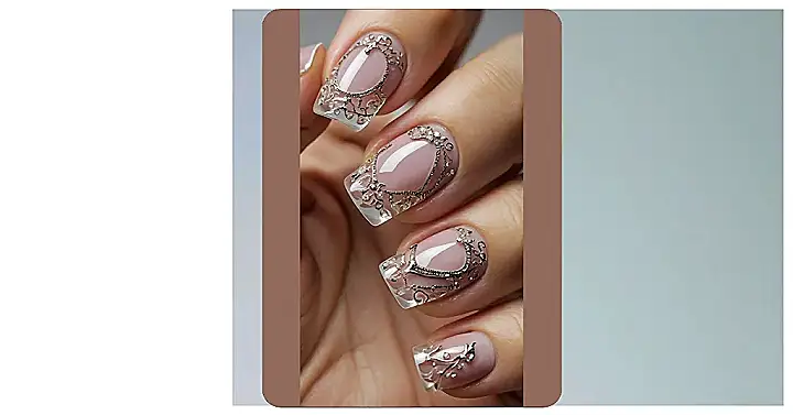 Hold up, let’s talk about these nails! They’re practically dripping with style and, dare we say, a little bit of juicy gossip. With that super chic nude base and the delicate silver lace designs, it looks like each nail is a tiny work of art, sparkling with little gems. These aren’t just pretty; they look like they’ve heard all the latest news and are about to spill it in the most fabulous way. You know these ‘gossip nails’ would be the first to know who’s crushing on whom, just by gracefully gesturing across the lunch table.