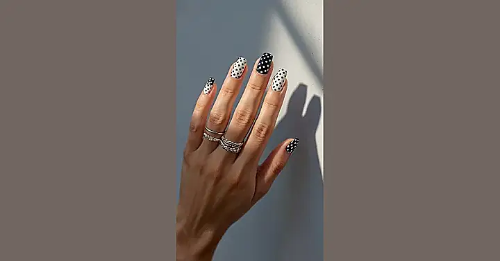 Who knew tiny dots could make such a big statement? This manicure totally nails the ‘polka dot nails’ trend, making your fingers look ready for a stylish celebration. Some nails are rocking the classic black background with bright white spots, giving off serious retro vibes, while others are showing off a subtler look with black dots peeking out from a soft pink base. It’s like a tiny, perfectly coordinated art show right there on your hand, almost making you want to count every single dot – good luck with that, there are a lot!
