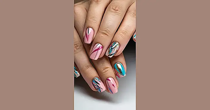 Forget everything you thought you knew about ‘boring’ nails, because these beauties just crashed the style party and brought all the cool vibes. We’re talking seriously modern nails that look like tiny, abstract masterpieces you can actually wear! With those chic blush pink bases mixed with electric teal, bold gold, and sharp dark lines, it’s like a mini art exhibition just popped up on your fingertips. You almost expect them to whisper, “Yeah, I’m kind of a big deal,” as you scroll through your feed.