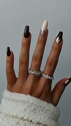 You know that feeling when you’re looking at all the different nail types and you’re like, “Whoa, there are SO many choices!” It’s like trying to pick out your favorite flavor of ice cream, but with nail polish and sparkles. In this picture, we’ve got some cool nails that are all about that extra something special. There’s a dark brown color that screams “sophisticated” and then there’s a light beige color that says “I’m here for the bling!” And let’s not forget the dazzling jewels, like the sparkly little snowflake on the beige nail!