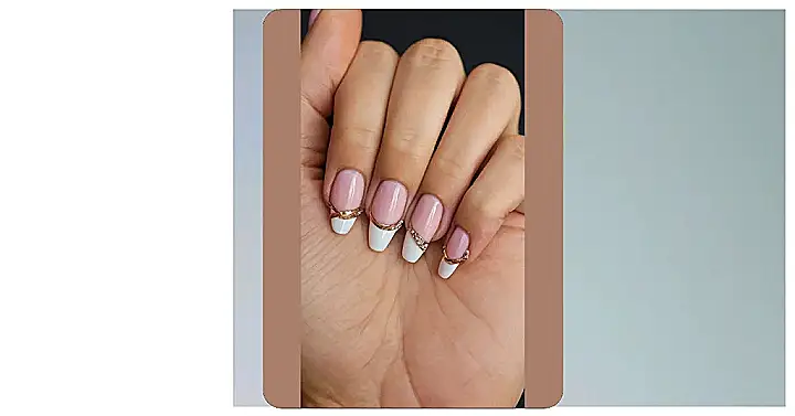 So, you’re bored with plain old nail polish? Then get ready for this! These nails are taking the classic French manicure and turning it up to eleven! They’ve got that cute pink and white thing going on, but then BAM! Gold accents and tiny rhinestones are added to make these nails super cool and a real showstopper. It’s like your nails are wearing tiny fancy belts.