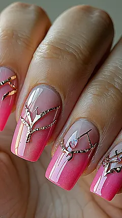 These nails are seriously having a moment! Look at that gorgeous pink fade, like a perfect sunset gradient right on your fingertips, topped off with fancy gold branches that look like they grew out of a fairy tale. Even though the keyword mentions ‘blonde nails’, these beauties clearly got the memo about being fabulous but decided pink was way more their vibe. They’re like the cool rebels of the nail world, proving you don’t have to stick to expected colors when you can shine this bright with sparkle and gold bits.