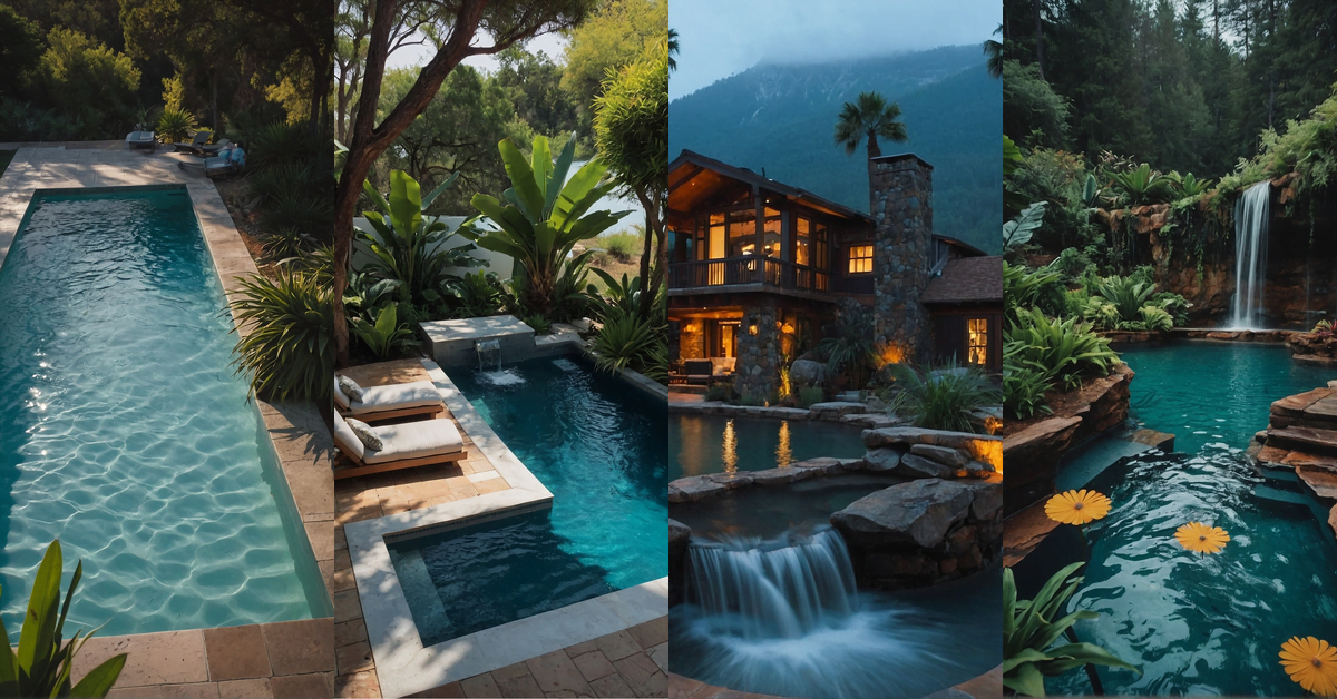 Ever found yourself yearning for a peaceful retreat that melds the tranquility of nature with the luxury of modern design? Envision a secluded oasis in your backyard, where vibrant green foliage cascades around a crystal-clear pool, creating a mesmerizing blend of color and texture. Lush palms gently rustle in the breeze, their fronds casting playful shadows on the glistening waters, inviting you to escape the hustle and bustle of daily life and immerse yourself in the beauty of nature.
