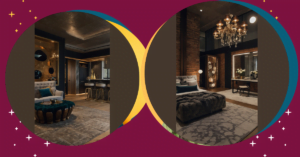 The color palette is a deep blue, like the night sky before a big storm, with pops of color from the red pillows and the artwork. The room makes you want to grab a book, curl up on the couch, and maybe even try to solve a Rubik’s Cube, all while feeling super inspired by your amazing surroundings. The ceiling light kind of looks like a jellyfish, but in a cool, modern art kind of way.