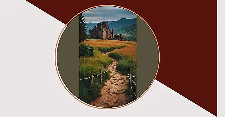 This picture makes me think of a time machine! Imagine being transported back to a time when castles ruled the land and knights roamed free. You’re on a quest to find a hidden treasure, and this path is your only guide. The ruins of the castle in the distance look pretty spooky, but also kind of cool, like a place where ghosts and secret passages might hide!