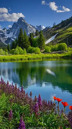 But then you see all the flowers, like they’re waving hello and saying “Hey! Come relax here for a while.” This lake looks like the perfect place to chill out, maybe read a book, or just listen to the sounds of nature. I bet you could even see a fish or two jumping out of the water! It’s like something out of a dream.