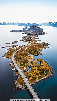 This isn’t just a road; it’s practically a yellow brick road for cars, winding through a golden-leaf wonderland in Norway! The way this bridge snakes across the water, connecting all these little islands, looks like someone played a super intense game of ‘connect the dots’ with a whole bunch of land and water. You’d half expect to see a friendly troll pop out from behind those vibrant trees, maybe asking for a toll in gummy bears. Those distant snowy mountains are just casually flexing in the background, making sure everyone knows this isn’t your average drive to school – it’s an epic adventure waiting to happen.