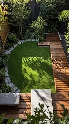 Got a backyard smaller than your bedroom? No problem! This picture proves you don’t need a football field to have a cool outdoor spot. Look, you can cram in some nice green grass (perfect for maybe one cartwheel, tops!), fancy wood planks for walking, and enough plants to make it feel like a mini jungle adventure, without the actual mosquitos (hopefully!). It’s like your own personal chill zone, sized just right for maximum relaxation with minimum lawn mowing.