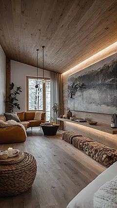 Step into this room and prepare for extreme levels of chill. This place practically screams, “Forget your chores, grab a blanket, and become one with the sofa!” With all that gorgeous light wood from floor to ceiling, it feels like you’re inside a giant, warm hug, perfectly insulated from the snowy wonderland peeking through the window. It’s the kind of spot where even your phone might decide to take a nap, letting you escape reality into a fluffy, comfortable haven without having to brave the cold for actual travel.