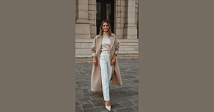 Hey there, fashion-forward friend! November’s got that chilly vibe going on, but that doesn’t mean your style has to hibernate! This picture totally nails the “November casual outfits” look. Check out that camel-colored coat – seriously cozy and perfect for warding off those autumn chills. Paired with those light-wash jeans and stylish ankle boots, it’s like a comfy hug for your legs, but way more fashionable. Plus, the cute little handbag adds a pop of sophistication. Who says casual can’t be chic?