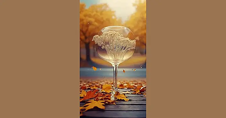 The picture shows a wine glass with a little forest trapped inside! The leaves are falling outside, but the forest inside the glass is frozen in time, like a tiny, magical world. Imagine you could shrink down and climb the trees inside the glass – you could have the whole forest all to yourself!