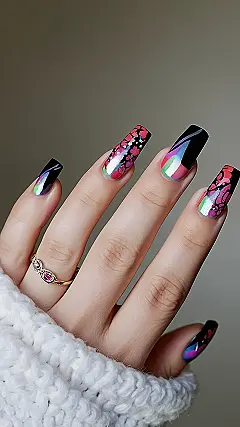 Those nails are seriously cool! They’re like a mix of dark, mysterious November nights with a splash of colorful autumn leaves. The black base makes them feel super edgy, like a spooky movie you’d watch on Halloween, but the bright colors and sparkly accents are like the sunshine peeking through the trees on a crisp autumn day. It’s like the best of both worlds!