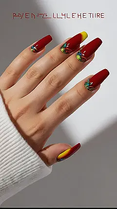 These nails are like a warm hug on a chilly November day. That deep red polish is seriously cozy, and the little colorful designs are like the leaves changing colors – so pretty! I can almost smell pumpkin spice and hear the crackling fireplace just looking at them.