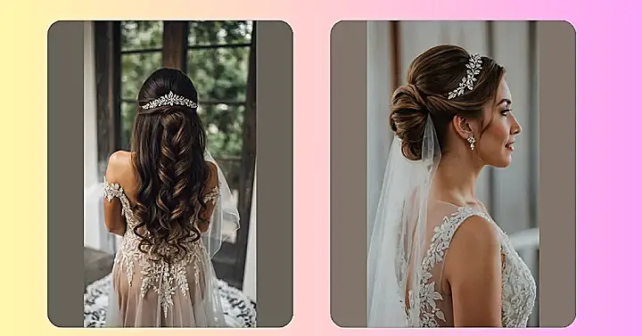 Just look at that fancy hairpiece! It’s not just a clip; it’s like a sparkly, leafy crown designed to make sure all eyes are on her, or at least on her fantastic hair. This bride hairstyle perfectly combines classic waves with a modern twist, probably making every other hairstyle in the room feel a little bit jealous. It just goes to show that a great bridal look isn’t just about looking fancy; it’s about looking absolutely stunning and feeling like a queen, maybe even doing a little hair flip on the dance floor!