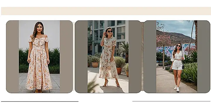 Look at this amazing picnic outfit! This flowy, off-shoulder dress with its dreamy floral print practically shouts ‘sunny day adventures and good vibes.’ You’d be blending in perfectly with all the beautiful flowers at the park, making everyone wonder if you just magically bloomed right out of a rose bush. It’s the kind of dress that makes you feel like you’re in a fancy movie montage, skipping through a meadow with a gourmet sandwich in hand. Just try to avoid any accidental ketchup spills – those beautiful yellow roses deserve better!