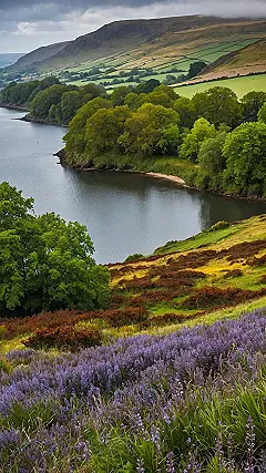 Wow, look at this! It’s like England decided to show off all its favourite outfits at once. You’ve got the fancy purple carpet laid out on the hill, like it’s ready for a celebrity arrival (maybe a sheep with a particularly fluffy fleece?). Then you have the big green hills in the background, all neatly patched up like a giant, comfy blanket, just chilling under a classic moody English sky. Down by the water, the trees are doing their best impression of fluffy green clouds. Seriously, trying to capture all this beauty with a camera for some epic England landscape photography must feel like you’ve hit the jackpot.